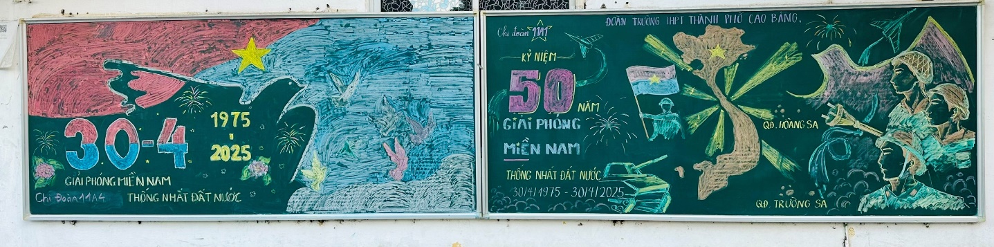 Các chi đoàn 11A1, 11A4 đã thực hiện trang tin thanh niên với chủ đề chào mừng 50 năm Ngày giải phóng miền Nam thống nhất đất nước, qua đó thể hiện lòng tự hào dân tộc và tình yêu quê hương sâu sắc. Những nét vẽ trên trang tin không chỉ tái hiện lại những hình ảnh lịch sử hào hùng mà còn khắc họa những biểu tượng của sự kiên cường và sức mạnh đoàn kết dân tộc. Mỗi bức tranh, mỗi chi tiết đều mang đậm dấu ấn của các em học sinh, thể hiện sự sáng tạo, tinh thần cống hiến và lòng kính trọng đối với những thế hệ đi trước đã hy sinh vì độc lập, tự do của Tổ quốc.